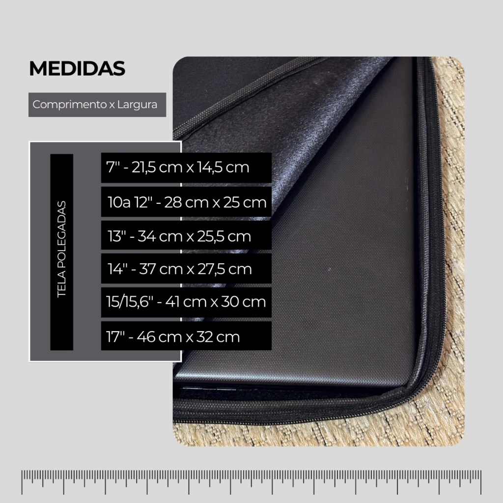 Seguindo as medidas abaixo basta medir o seu notebook e verificar qual dos tamanhos da capa se encaixa para seu modelo, por exemplo: